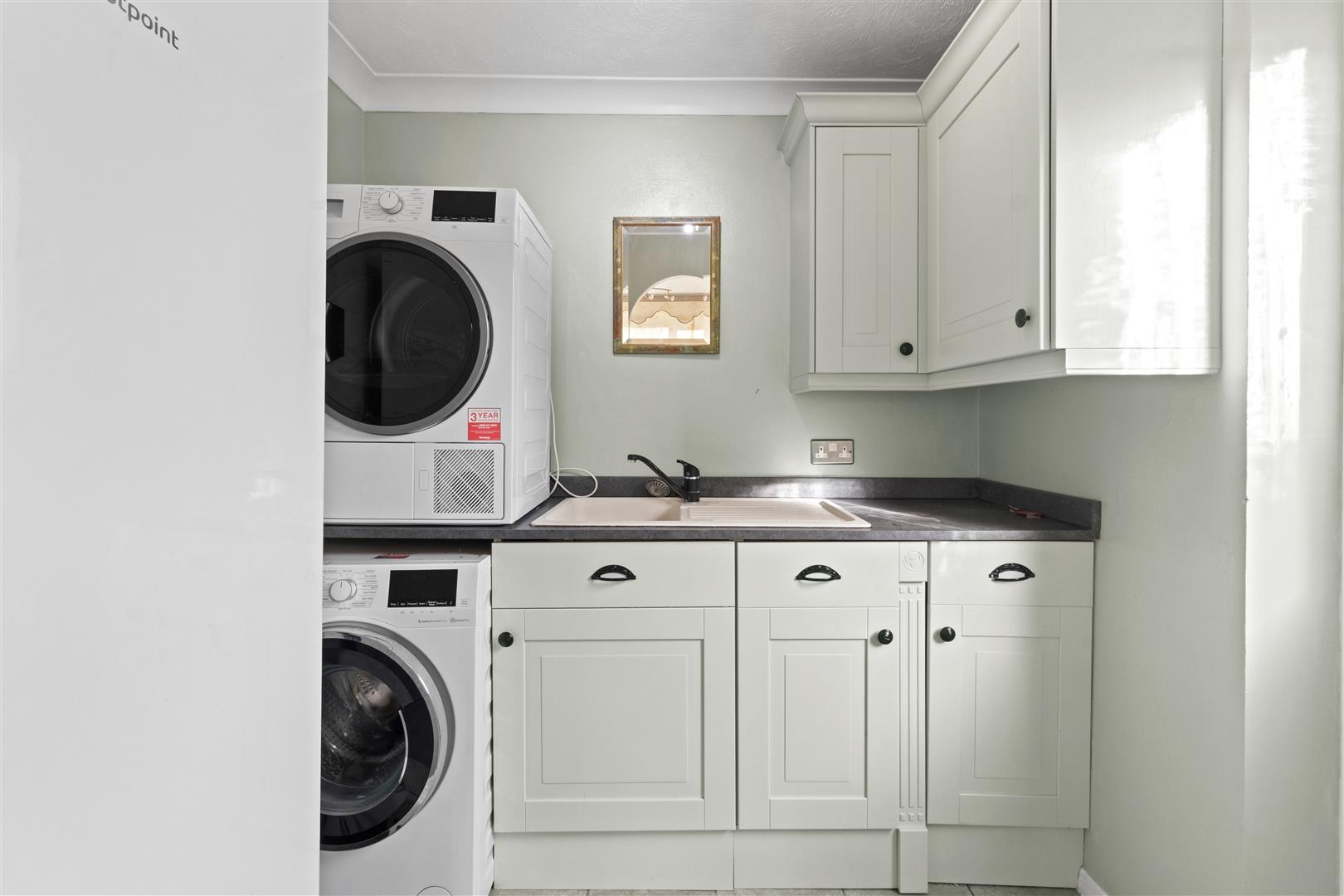Well-equipped with a generous range of fitted base and wall units, integrated appliances, including a dishwasher, gas hob, and electric oven. The worktop wraps around three walls and includes a stainless steel sink. A rear-facing window offers beautiful views.