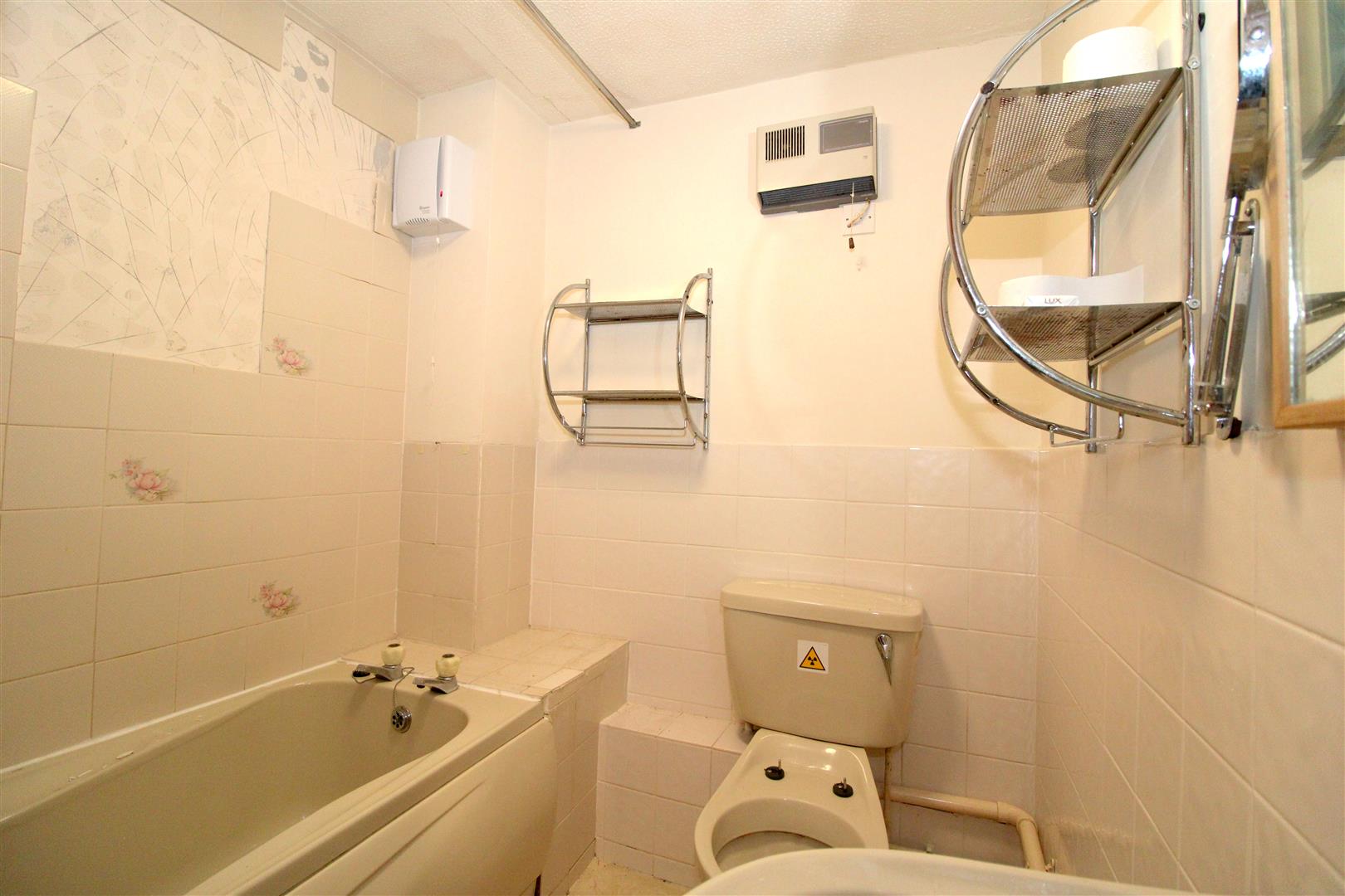 Comprising bath with Triton electric shower above. Pedestal wash basin and close coupled WC. Part tiled walls.