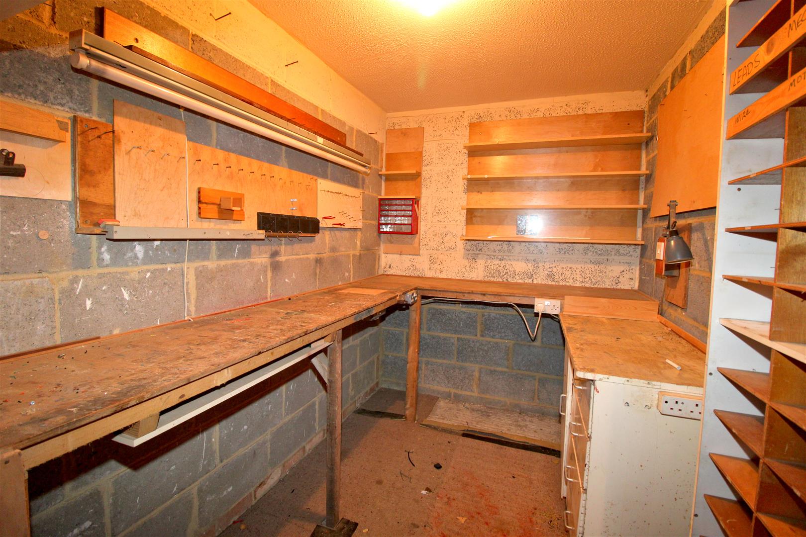 Accessed via up and over door with light and power. Door to Workshop space with wall and base units and work surface.