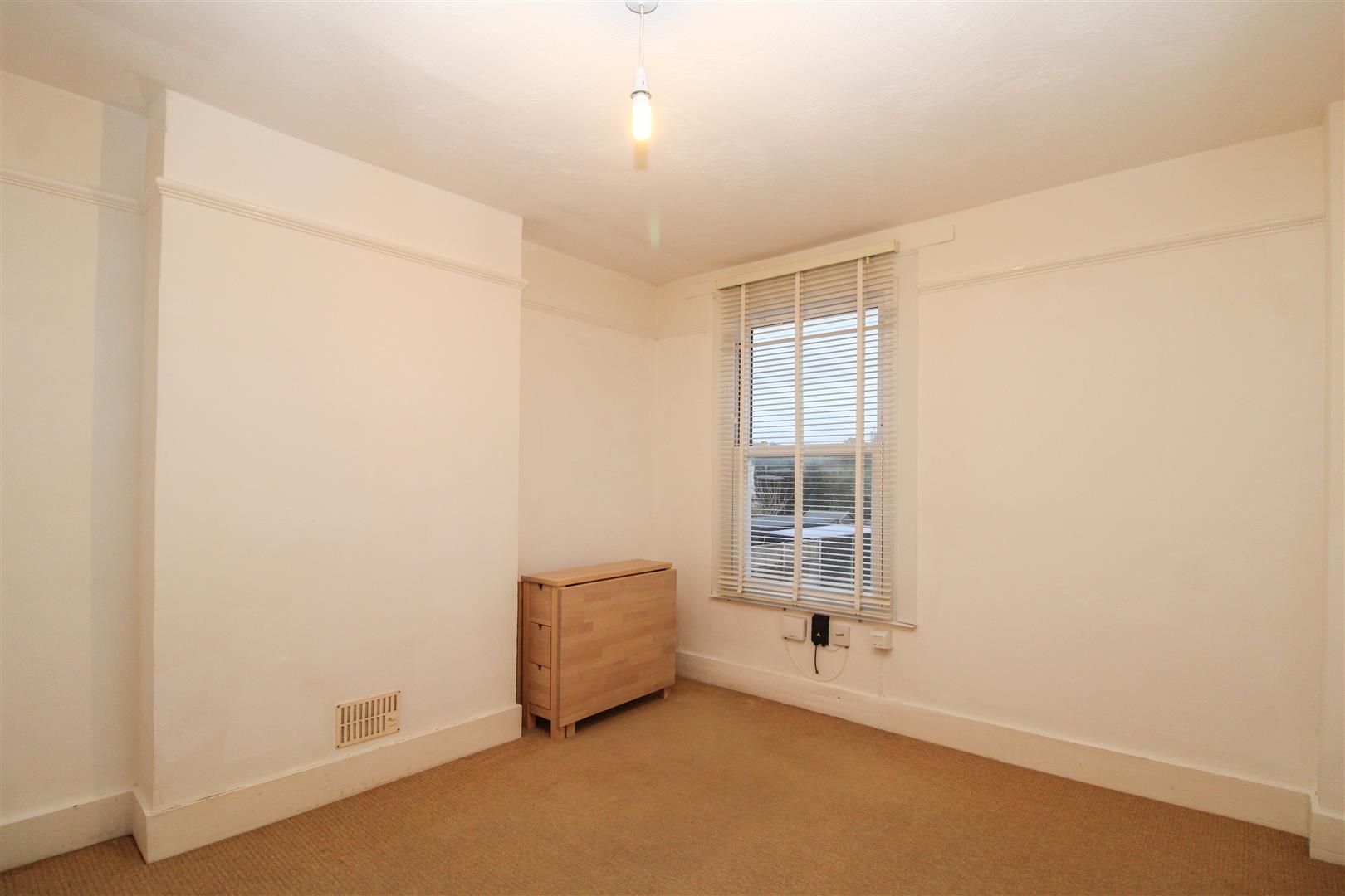 Bedroom one features built-in wardrobes, a radiator, and a large window overlooking the road and town centre.