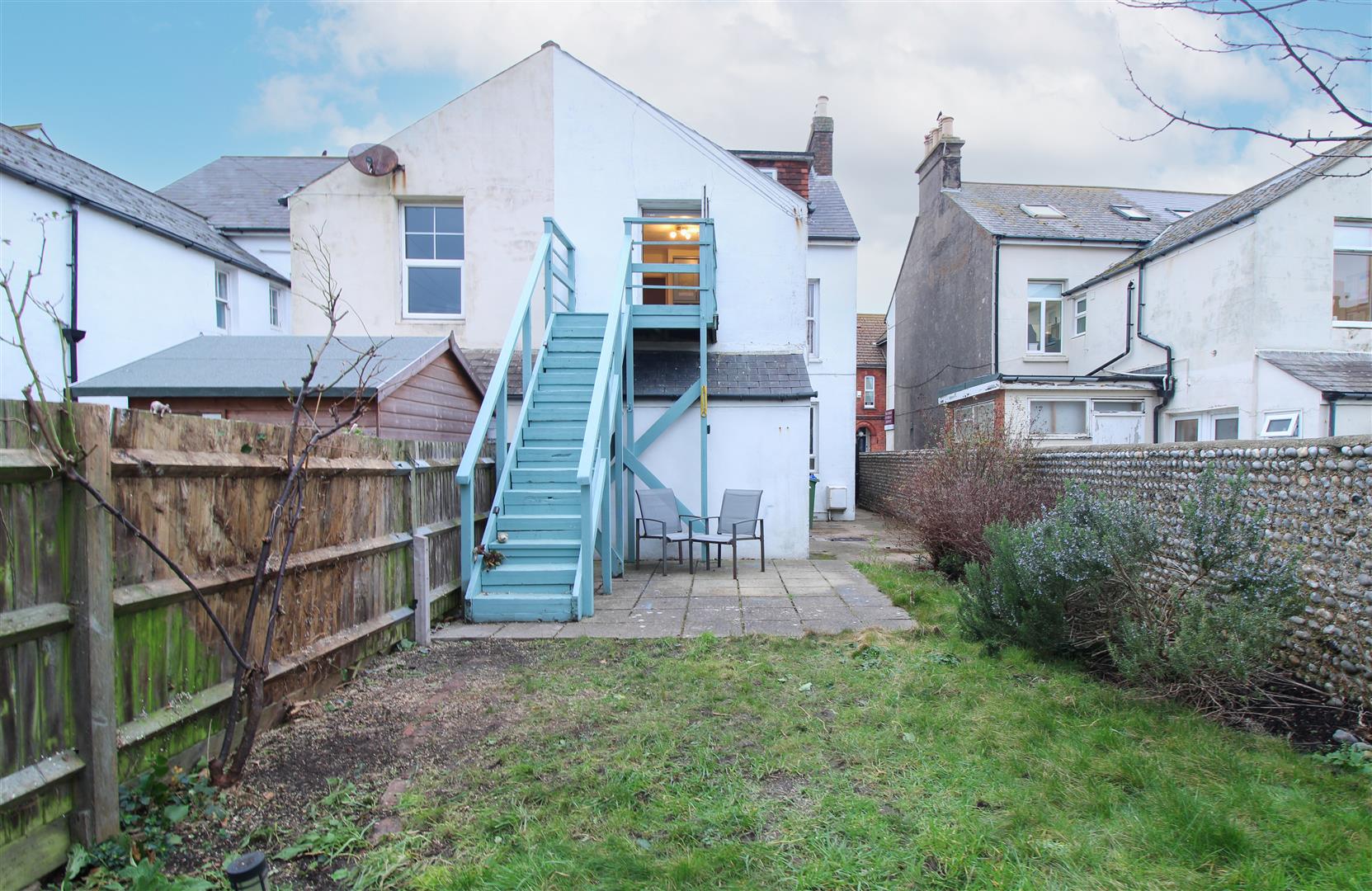 Externally, the garden is a key feature of the property. It offers concrete side access from the road with a secure gate, a patio area, and a garden mostly laid to lawn. Additional benefits include a garden shed and decked stairs leading up to the kitchen and access to the flat, with a decked area located at the top of the stairs—ideal for seating.