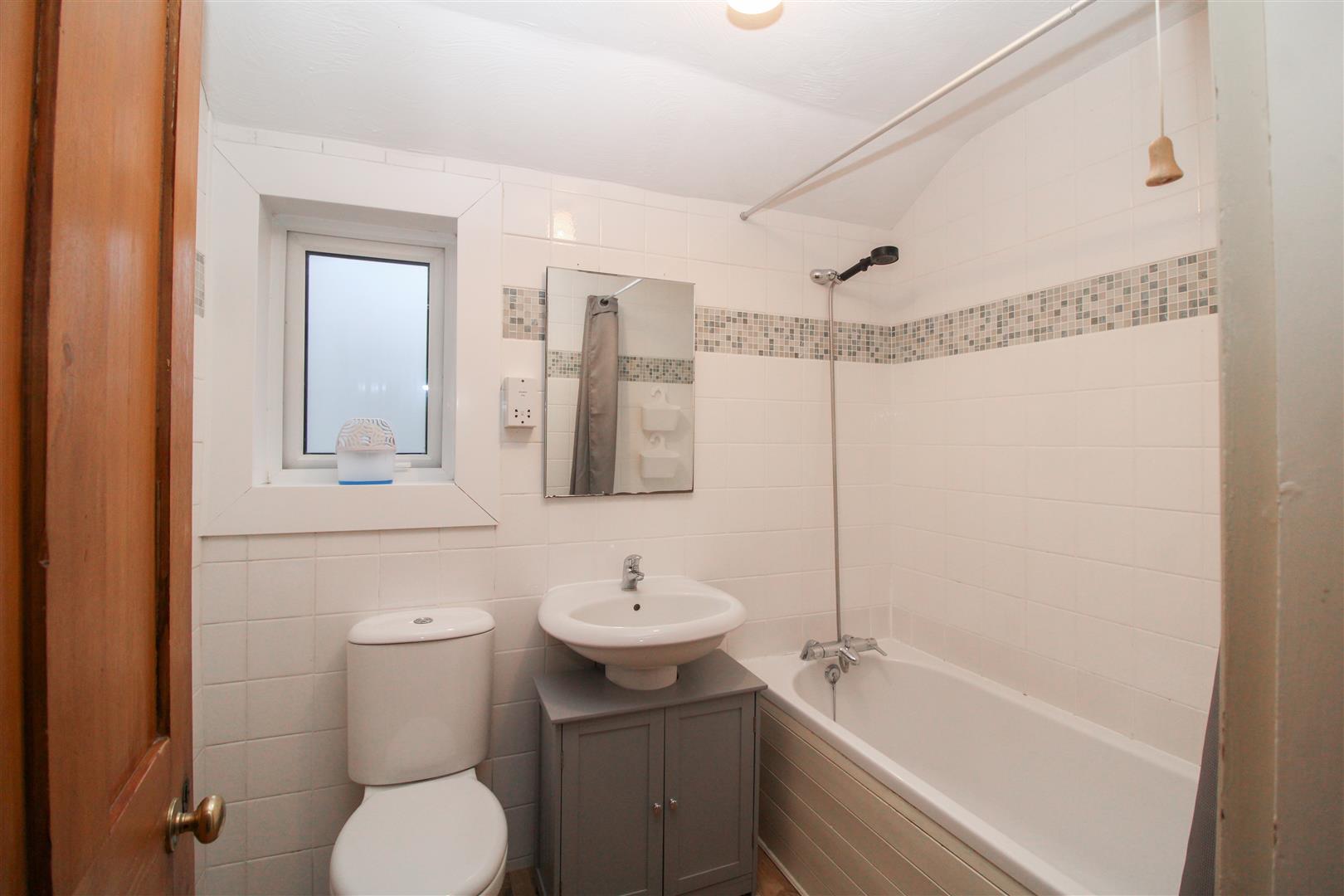 The bathroom includes a bath with shower, WC, wash basin, and frosted side window.