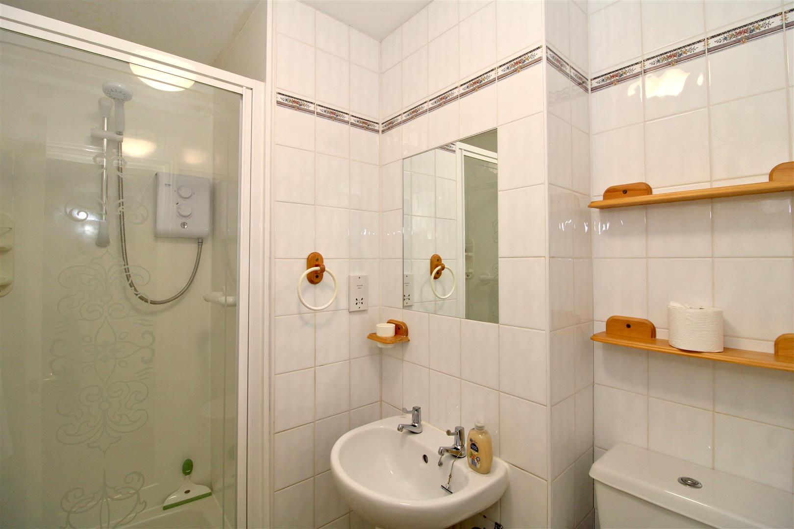 Shower cubicle with Triton electric shower, pedestal wash basin, and close coupled WC. Tiled walls, extractor fan and radiator.