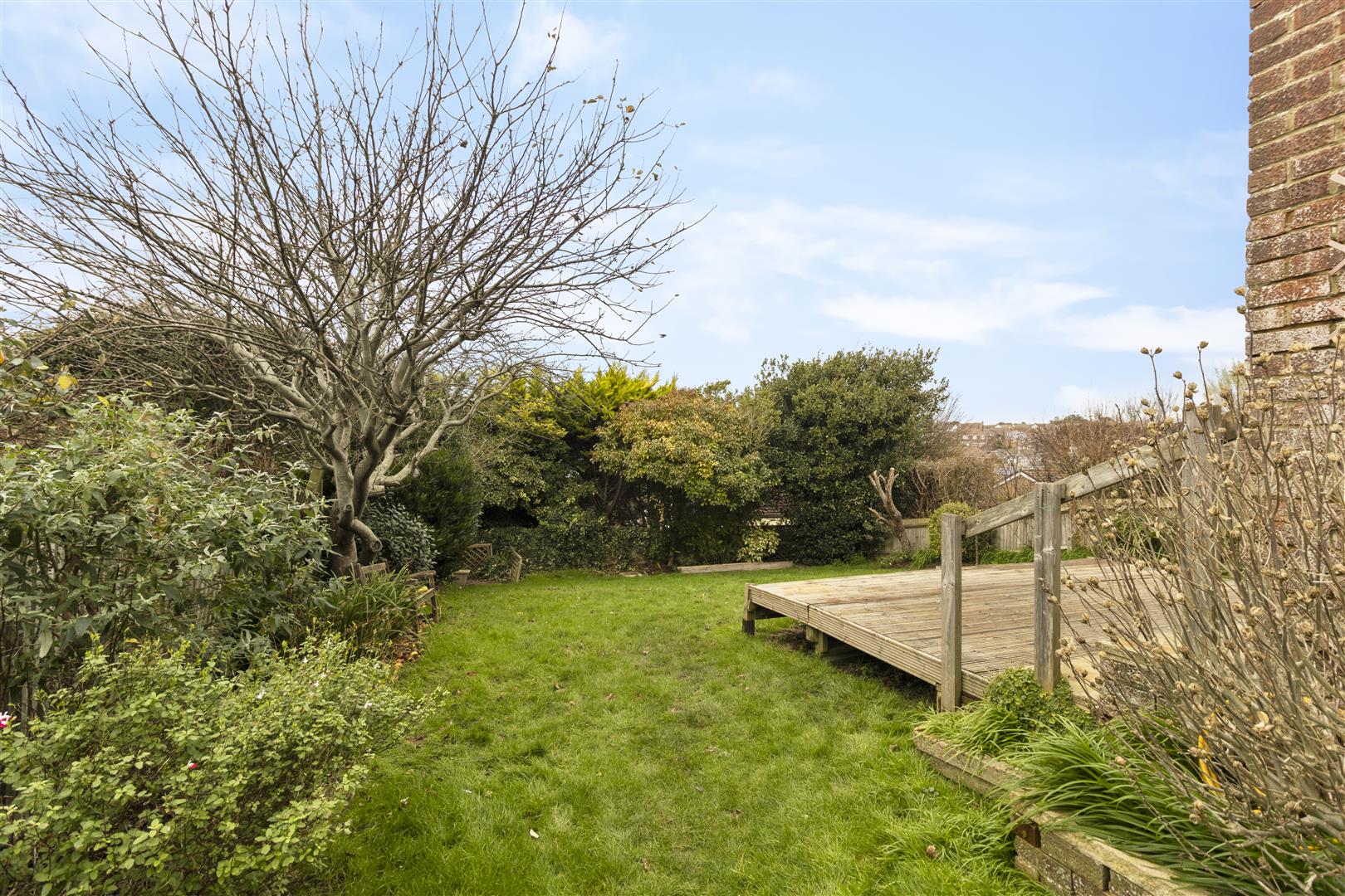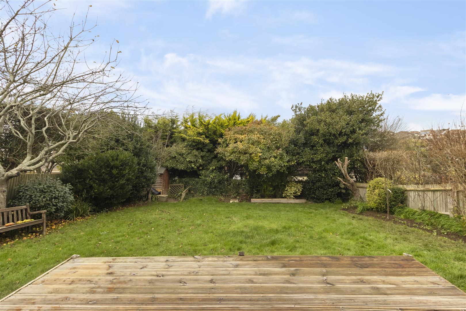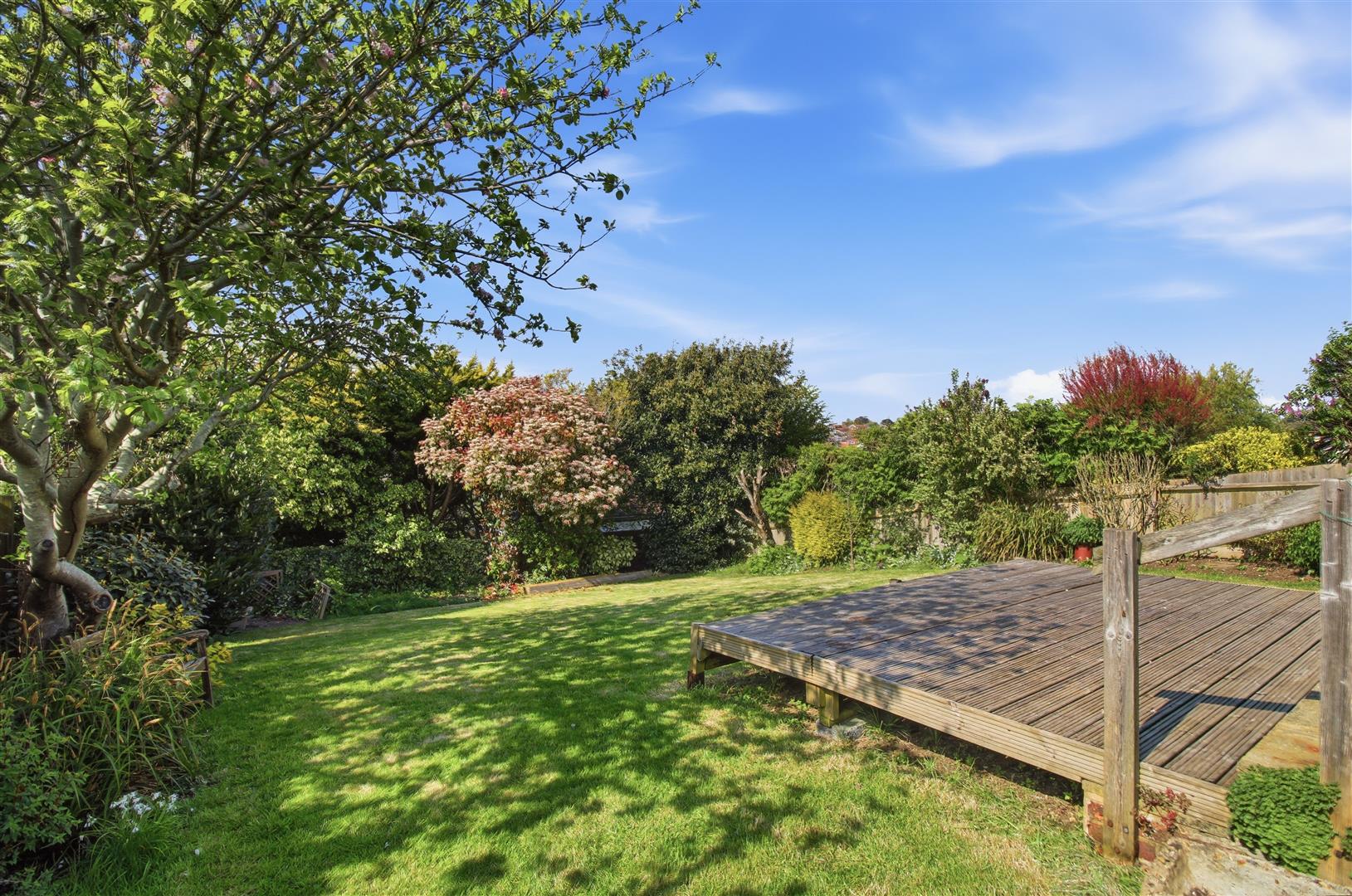 North Westerly aspect and being mainly to lawn. Well stocked with shrubs, mature trees and apple tree. Two timber sheds and two timber storage units. Area laid to decking and gated access via both sides.
