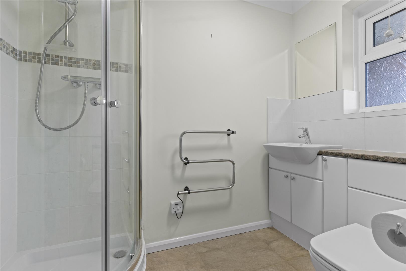 Shower enclosure, vanity unit with inset wash basin and close coupled WC. Heated towel rail. Double glazed window. Part tiled walls.