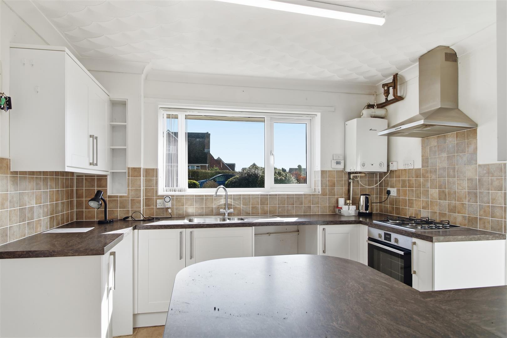 Wall and base units. Work surface with inset sink and drainer. Wall mounted Worcester-Bosch boiler. Space for washing machine and dishwasher. Four ring gas hob with electric oven below and cooker hood above. Part tiled walls. Integrated fridge and freezer. Double glazed window to front and door to side. Serving hatch to: