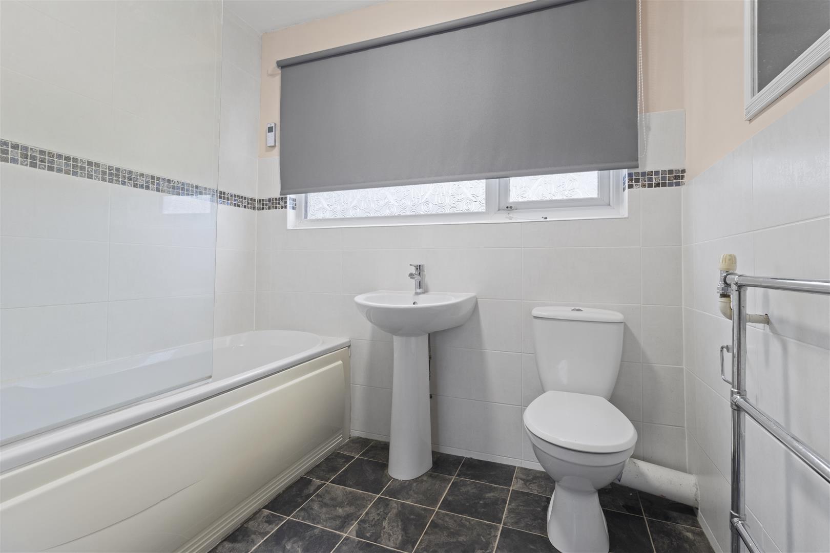 White suite comprising pedestal wash basin, close coupled WC and bath with shower above. Heated towel rail. Double glazed window and part tiled walls.