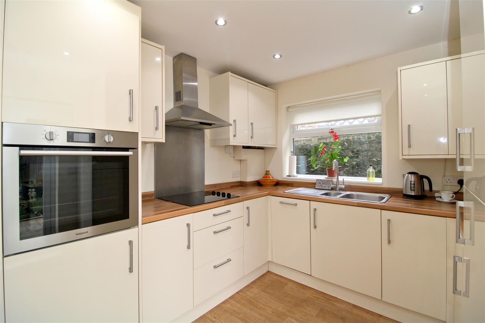 Modern high gloss base units and matching wall cupboards. Work tops with inset one and a half bowl sink unit and inset electric hob with cooker hood above. Integrated fridge-freezer, washing machine and slimline dishwasher. Housing unit with fitted eye-level oven/grill and cupboard containing Glow-worm gas fired combination boiler. Plinth mounted heater. Space for small table and chairs. Double glazed, double doors to rear garden.